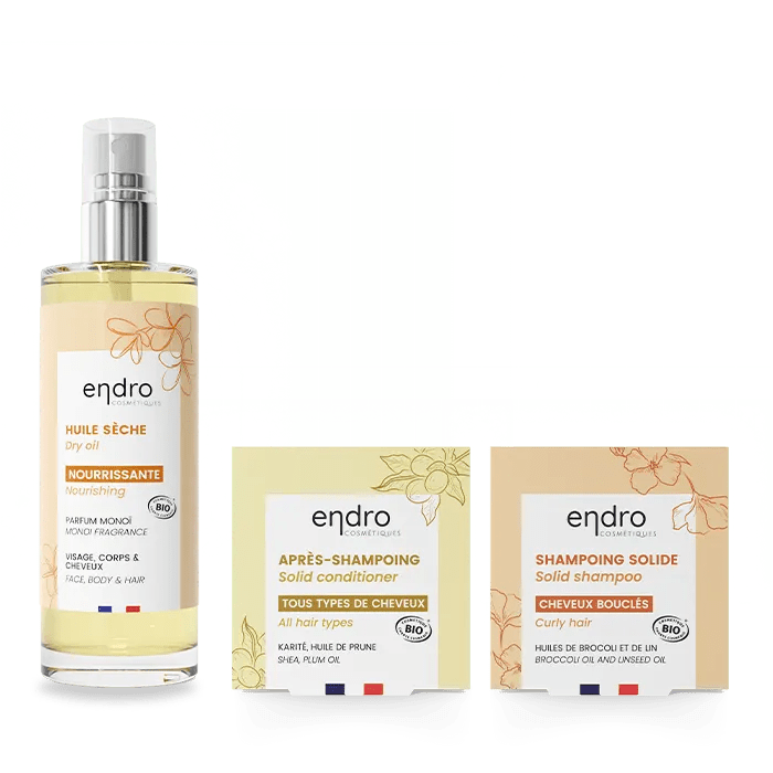 Le kit idéal pour prendre soin des cheveux ondulés, bouclés ou frisés : il contient notre shampoing solide gainant et disciplinant, notre après-shampoing solide et une huile sèche.